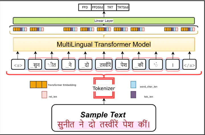 Eye tracking data during reading is a useful source of information to understand the cognitive processes that take place during language comprehension processes. Different languages account for different brain triggers , however there seems to be some uniform indicators. In this paper, we describe our submission to the CMCL 2022 shared task on predicting human reading patterns for multi-lingual dataset. Our model uses text representations from transformers and some hand engineered features with a regression layer on top to predict statistical measures of mean and standard deviation for 2 main eye-tracking features. We train an end to end model to extract meaningful information from different languages and test our model on two seperate datasets. We compare different transformer models and show ablation studies affecting model performance. Our final submission ranked 4th place for SubTask-1 and 1st place for SubTask-2 for the shared task.